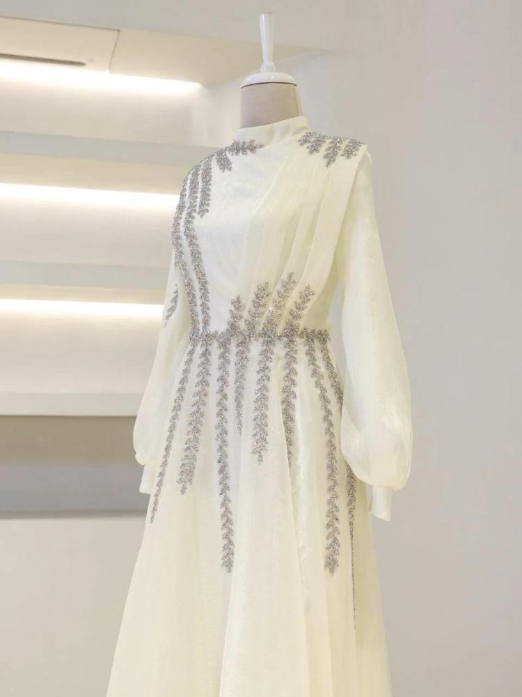 يجمع بين البساطة والفخامة، مع تفاصيل متقنة تجعل الفستان مناسبًا للمناسبات الراقية.